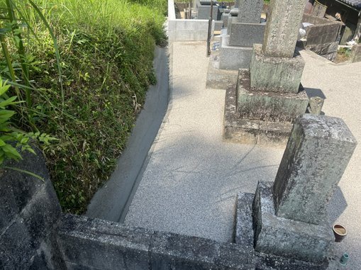 ご要望はもうひとつあり、特に最近皆様が口を揃えて言われるお悩みでもある雑草の対策です。 それと同時に山から流れ降りてくる雨水にもお困りでしたので、墓所内をコンクリートにて施工して、山から降りてきた水を流す様な排水も完備出来るように設計致しました。
