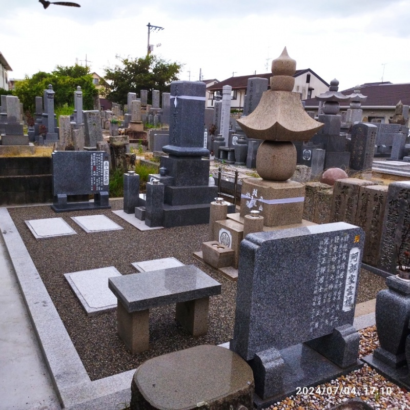 ② 庵治石で夫婦墓を建てており、同じ様な石種で棹石だけを取り換え、戒名板を新たに設置して先祖墓にする。